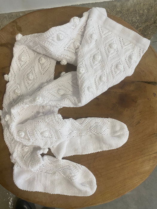 Media hasta la rodilla de color blanco, realizada en perle 90% y licra 10%.