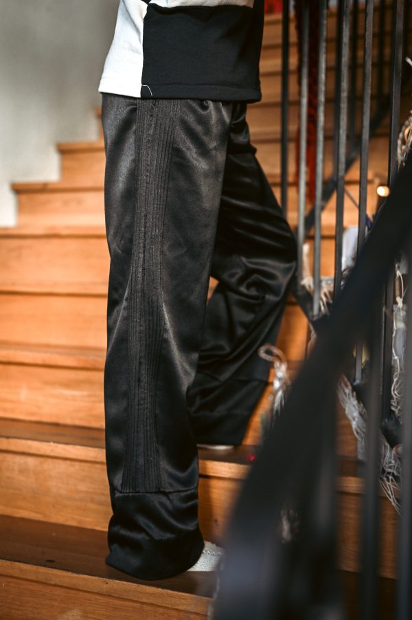 Pantalón realizado en satén de cintura alta, bolsillos. Destaca detalles de nervios laterales, tablón en el bajo.